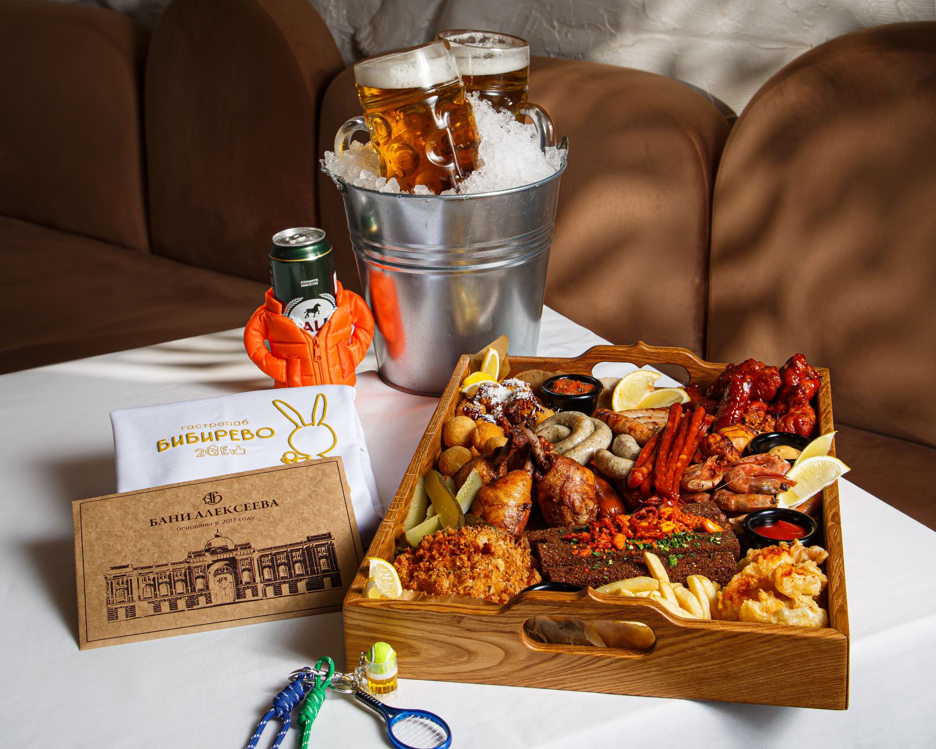 В Гастропабе «Бибирево» решили, что 23 февраля — это не про символические тосты, а про стол, который ломится от количества еды. На праздник запустили «Банный сет» за 9 000 рублей: крылья баффало, креветки, шашлык из цыплёнка, ассорти колбасок, гренки, фри, соленья и 2 литра «Жигулёвского». Плюс большой розыгрыш подарков от «Бани Алексеева»: от футболок до визита в банный комплекс.