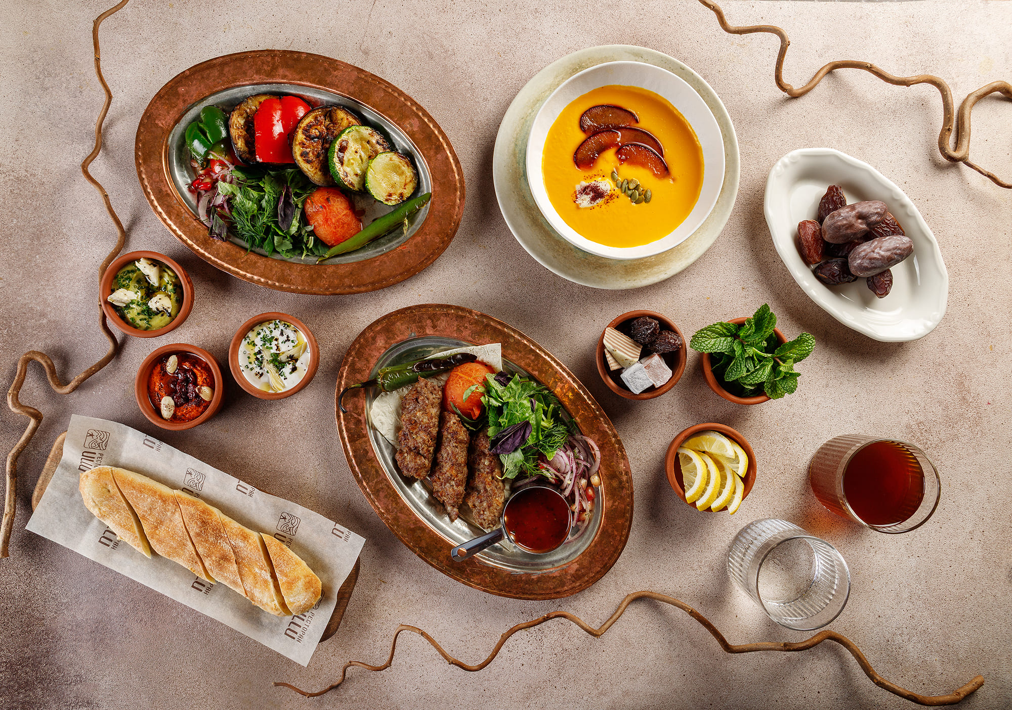 Трапеза традиционно начинается с фиников, лимона и свежей мяты, подаётся с домашним узваром из кураги и завершается восточными десертами: баклавой с мороженым или холодной пахлавой. Специальное предложение к Рамадану действует с 19 февраля по 19 марта.