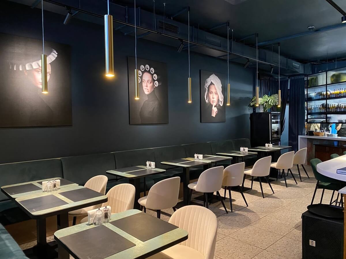 В Brasserie Lambic на Шаболовке мягкое освещение, а в интерьере преобладают уютные оттенки — от бежевого до тёмно-шоколадного. В качестве акцентов выбраны комнатные растения и стильные картины, отражающие тематику ресторана.