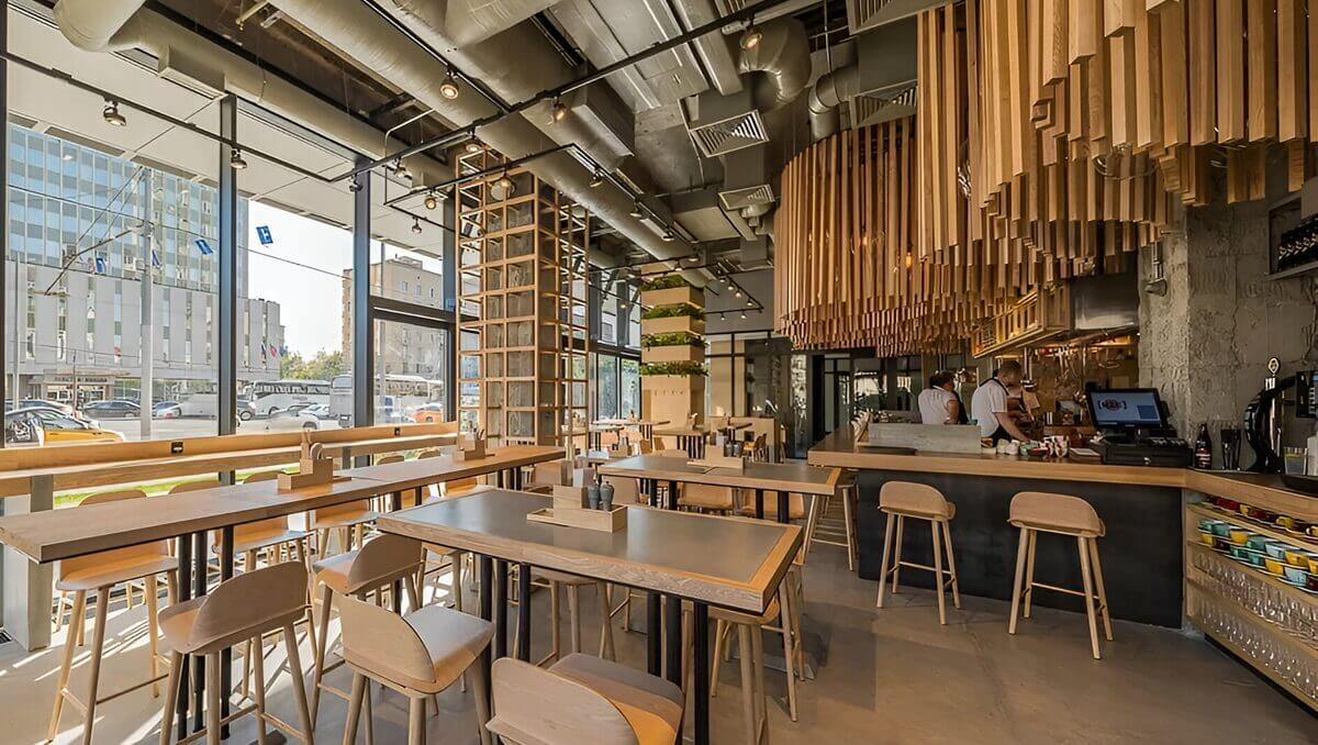 В зале много деревянных элементов: столешница барной стойки, столики и стулья, декоративные полки и панели на стенах. А пространство над баром украшает гирлянда из деревянных трубок, которые напоминают стебли бамбука.