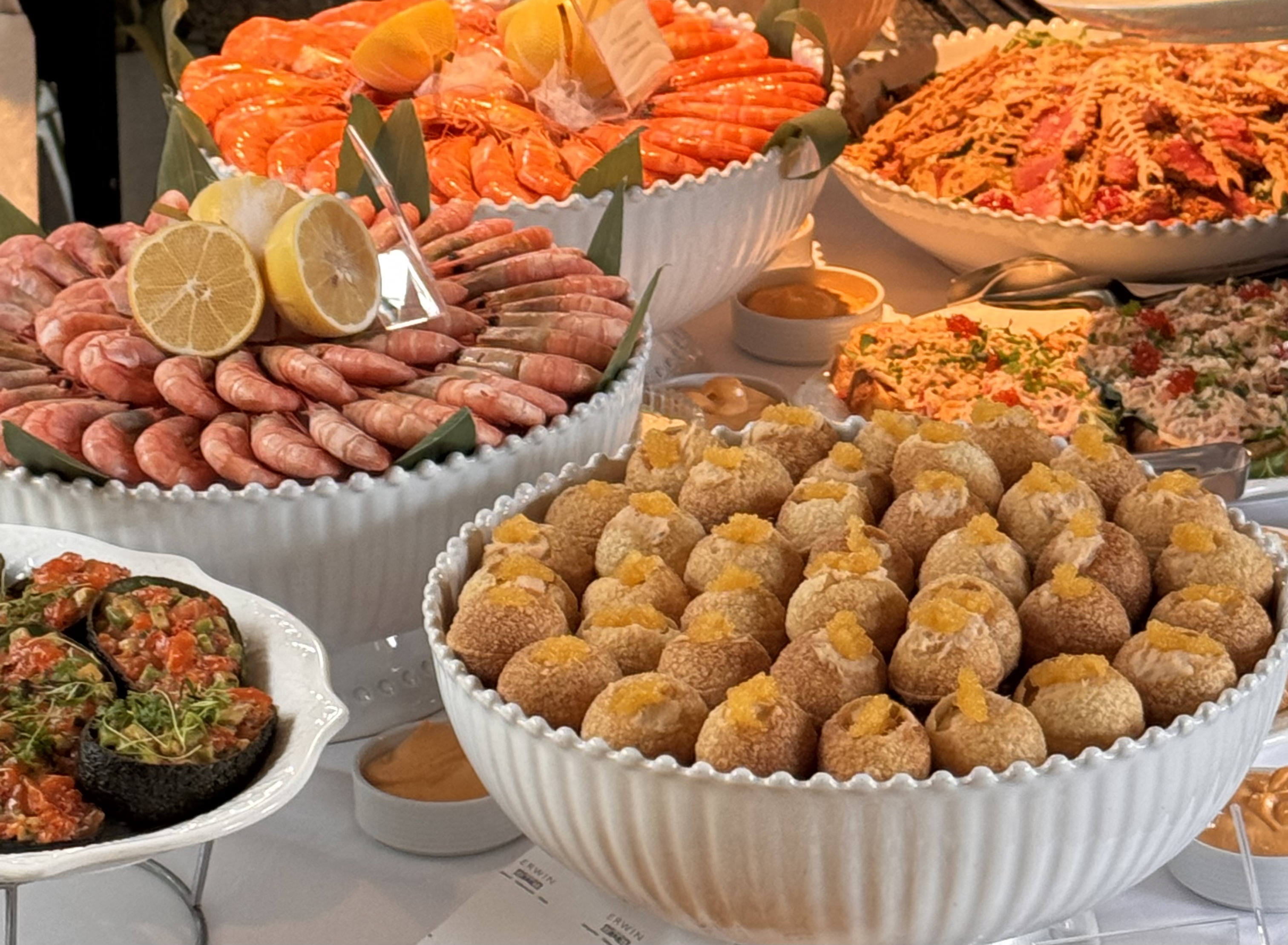 Центр воскресного бранча в ERWIN.Pavilion.Patriki — мидии в белом вине, рагу из морепродуктов, фондю с креветками, котлеты из щуки, паэлья с морепродуктами, черноморская барабулька с миндальными хлопьями, куриный рулет с трюфелем и рёбра кальби. В качестве гарниров подают спаржу, аджапсандал, картофельный гратен и пирог с курицей и грибами.