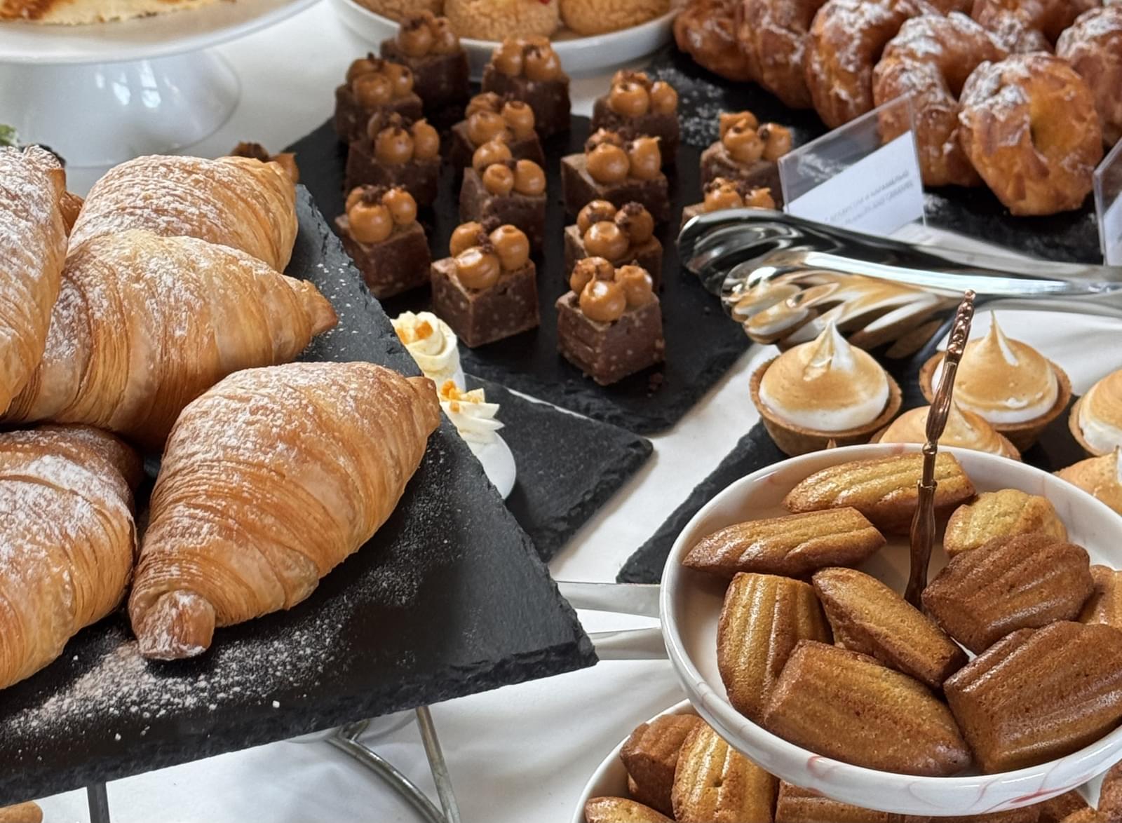 В финале шведского стола, а в нашем случае уже вполне московского, обширное десертное ассорти: заварные мини-кольца, брауни с арахисом и карамелью, черёмуховый медовик, павлова с ванильным кремом и манго-маракуйей, мини-мадлены с апельсином, кокосовая панна-котта с клубникой, тирамису, чизкейк, шу с ванилью и клубникой, мини-круассаны, варенье трёх видов, печенье и сезонные фрукты.