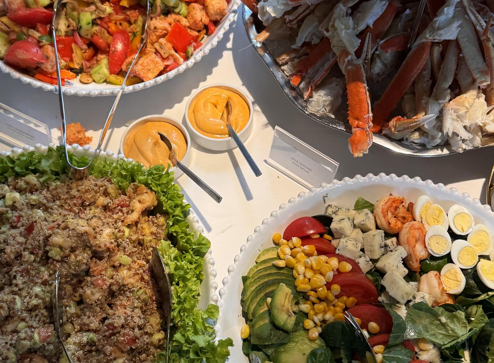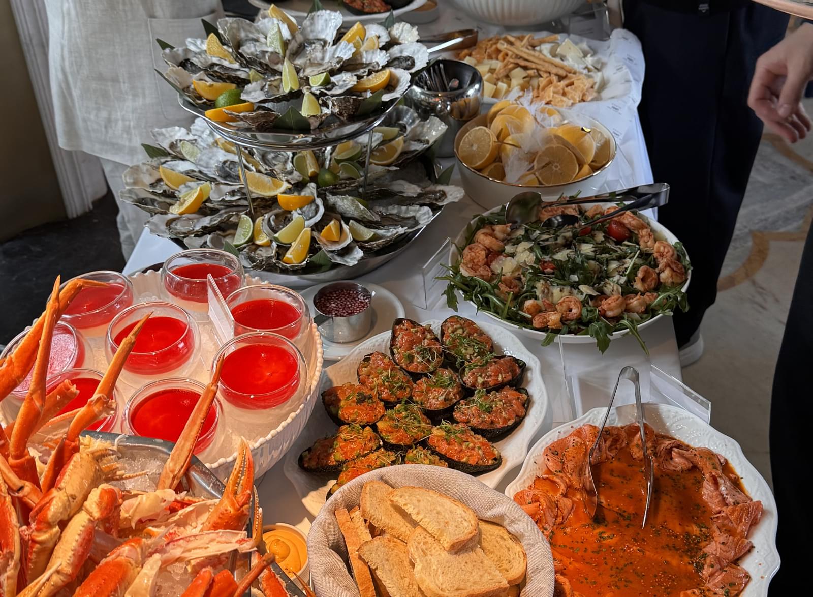 Бранч в «Павильоне» начинается с большого фуршетного стола, на котором расположились и холодные закуски, и морепродукты, и горячие блюда, и гарниры, и десерты: магаданская и северная сладкая креветка, краб опилио, устрицы. Дополняют подачу сыры, оливки, артишоки, чука с эдамаме, паштет из щуки, вафли с уткой и луком конфи, брускетта с треской, бриошь с крабом и икрой тобико, блины с лососем и красной икрой, круассан с мортаделлой, крем-чизом и трюфелем, рыбный рийет, мини-буратта, вителло тоннато, моцарелла с томатами и песто, обожжённое сашими из лосося, севиче из сибаса и киноа с креветками.