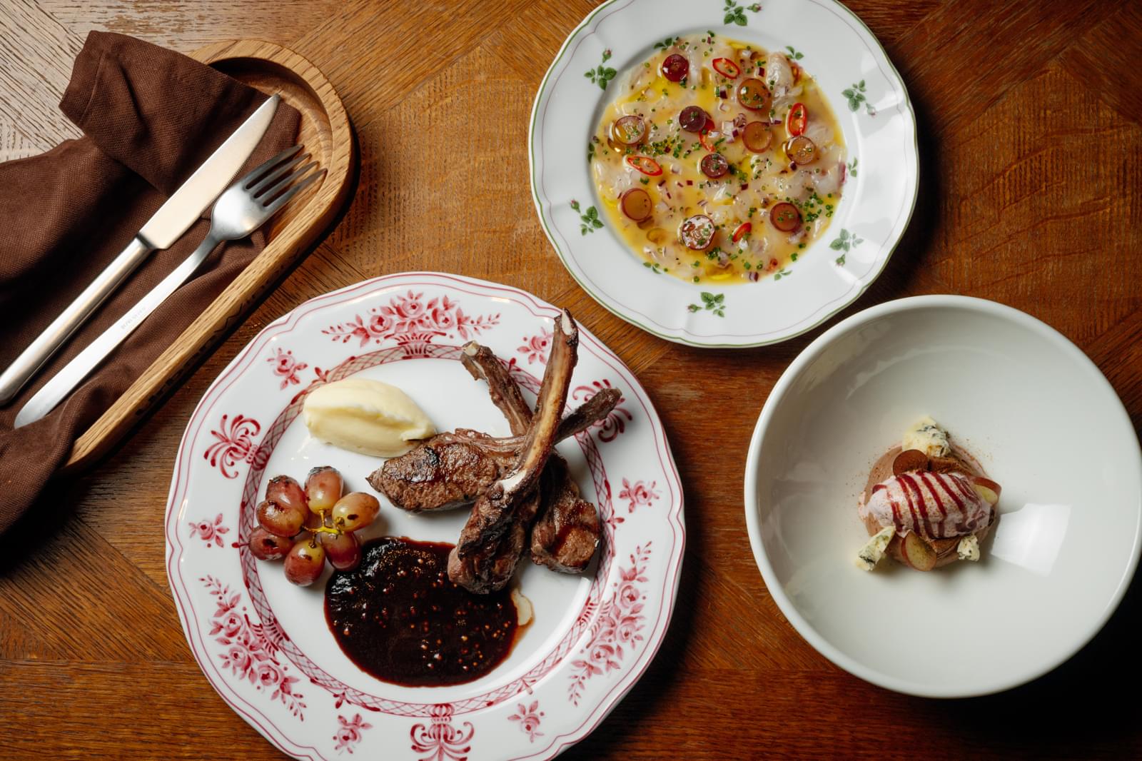 Дегустационный сет: севиче из сибаса с маринованным виноградом, каре ягнёнка с копчёным виноградом и пюре, шоколад, монте блун и мороженое WIPA. 3 900₽