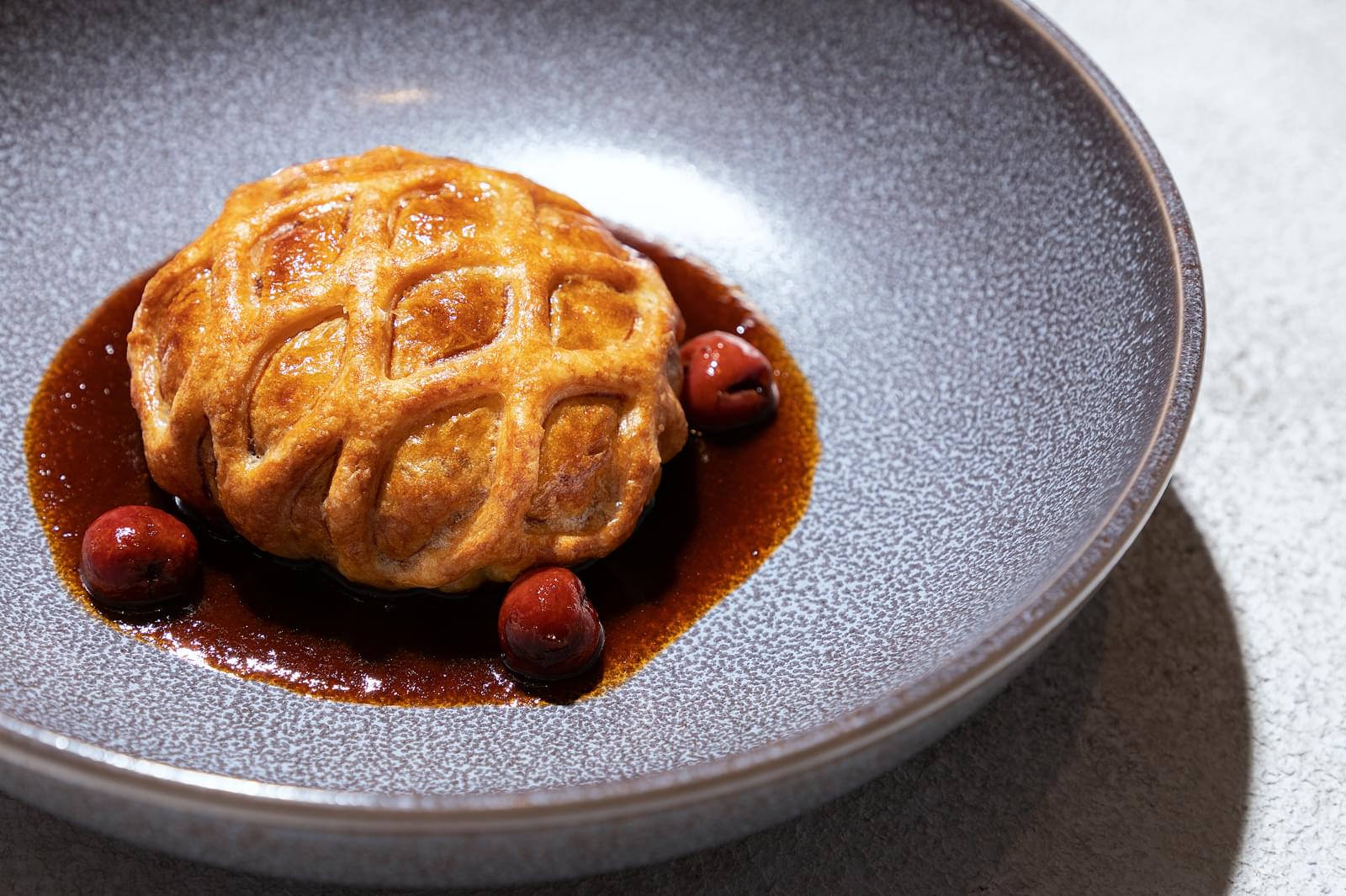Дегустационный сет: свёкла с уткой и козьим сыром, телячий язык с картофельным кремом, пирог с уткой и вишней, сюзма с хурмой и мёдом. 4 200₽