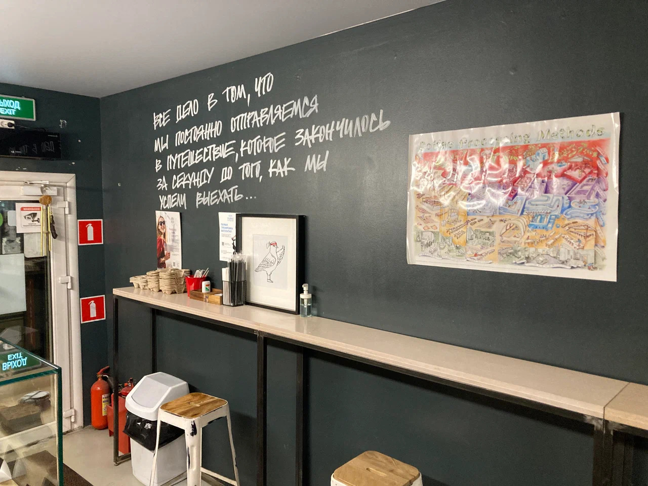 Кофейня на территории музея Яндекса. В меню кофе и свежая выпечка: сэндвичи, круассаны, пироги, чиабатты.