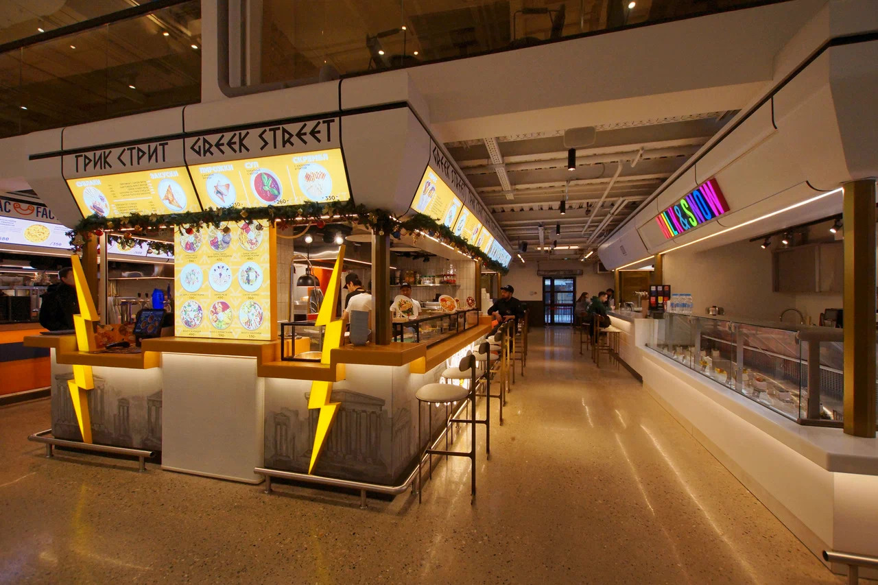 Корнер с греческим стрит-фудом на территории комплекса “Депо Три вокзала”.