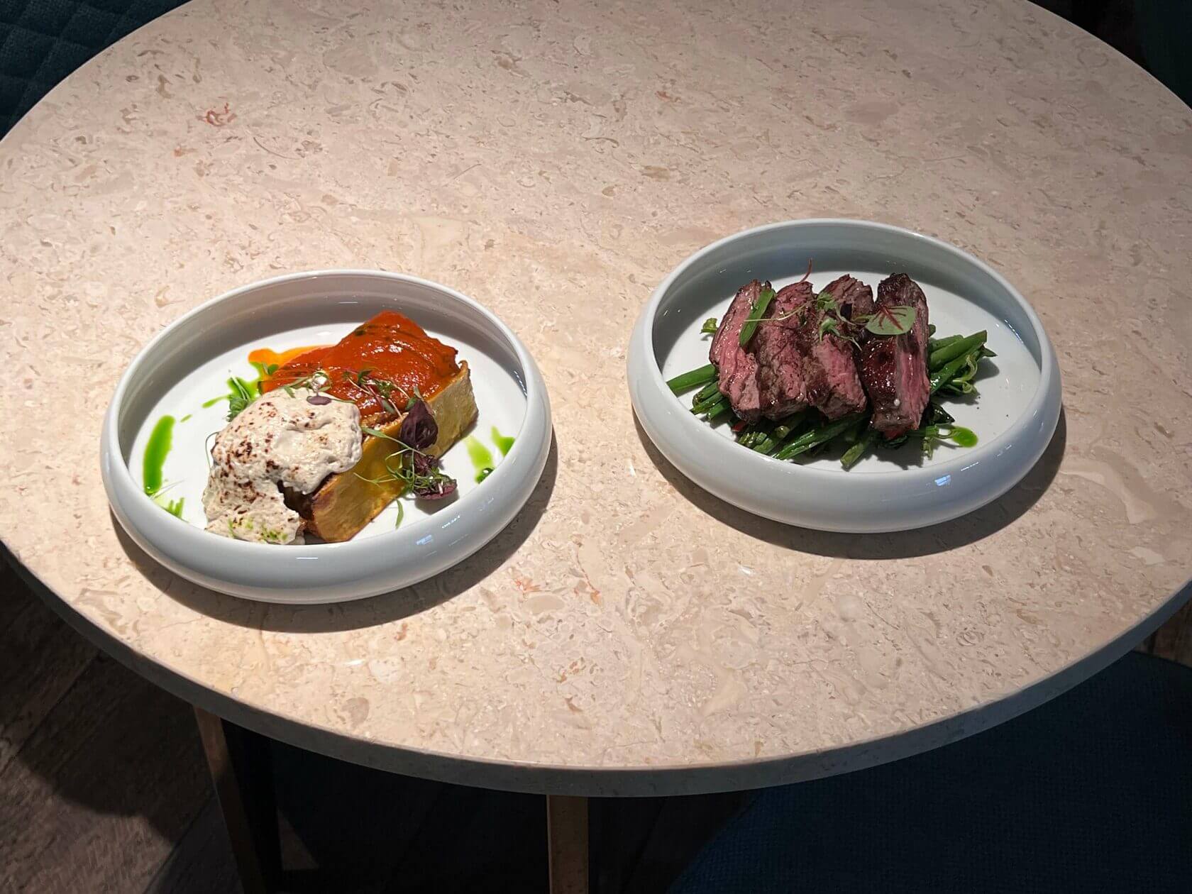 Из раздела «Ризотто и паста» была выбрана классическая лазанья (740₽), а из раздела «Основных блюд» — бавет со шпинатом и стручковой фасолью (1100₽). Бавет — это стейк, который вырезается из филейной части бычка, между рёбрами и бедром. Такое мясо отличается сниженной жирностью и нуждается в умелых руках повара, чтобы стать нежным и мягким. Мужская часть редакции одобрительно отнеслась к такому «особенному» стейку.
