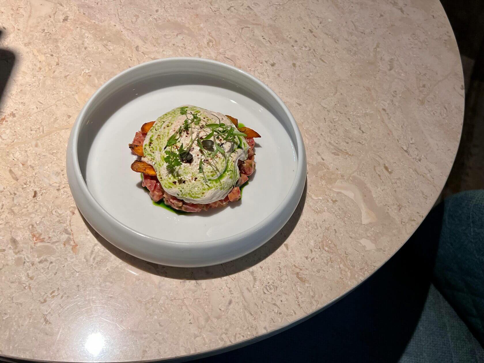 Тартар из говядины с бататом и трюфельным муссом (820 ₽) будто улыбается на фото, хотя на деле, хорошее настроение появилось у редакции. После того, как она это блюдо попробовала, разумеется. Вышло сочно и сытно.