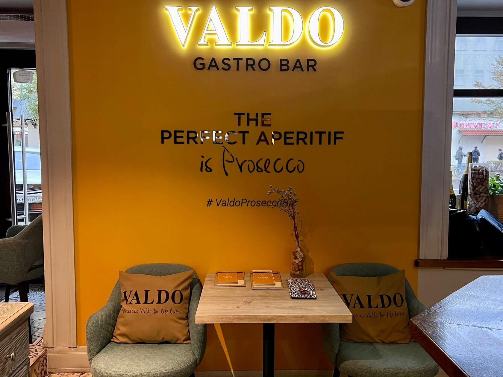 Здесь нет пафоса и современного искусства, здесь только сомелье, огромная винная карта и легендарный просекко от Valdo, в честь которого, легко догадаться, заведение и получило своё название.
