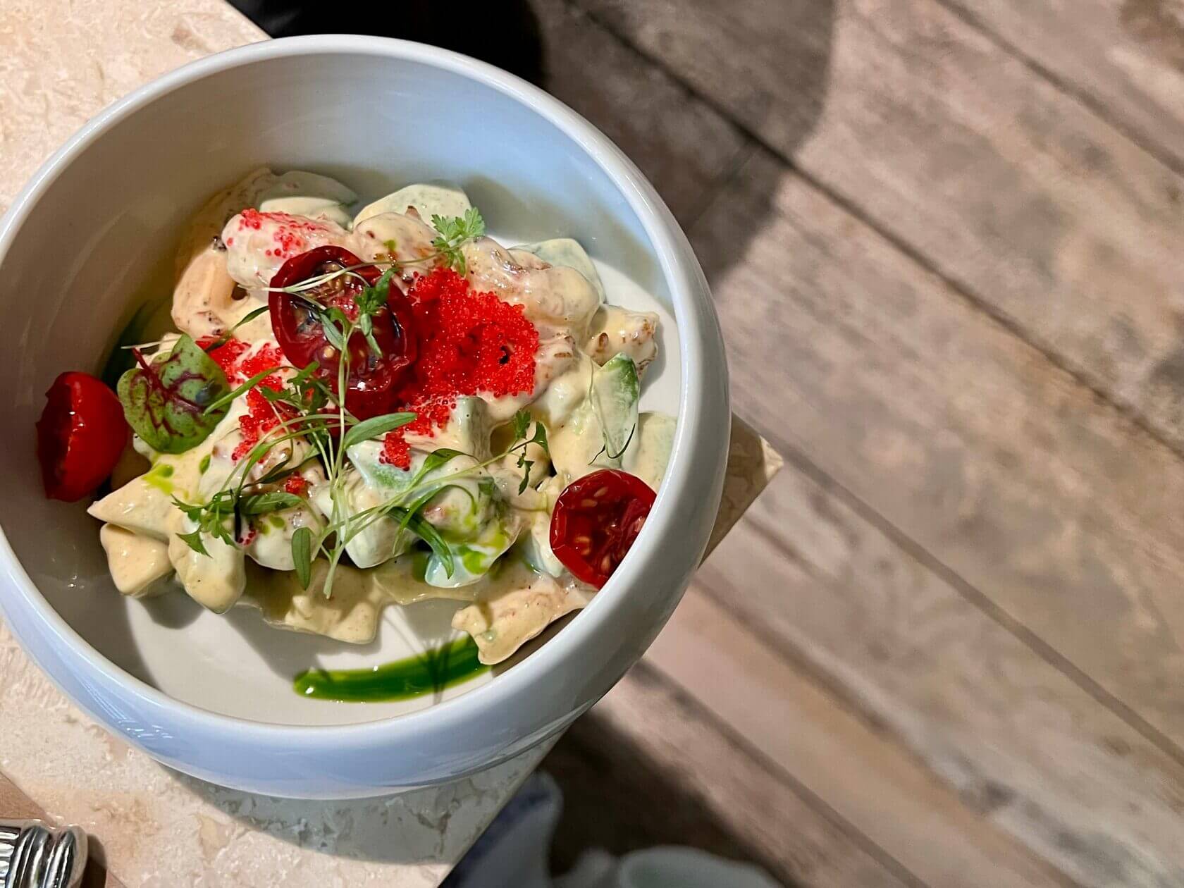 Севиче из креветок (720₽) — идеальное блюдо для романтичного тет-а-тета. Упругие креветки и мягкий авокадо увлекают за собой в тарелку и явно намекают на бокал в сопровождение.