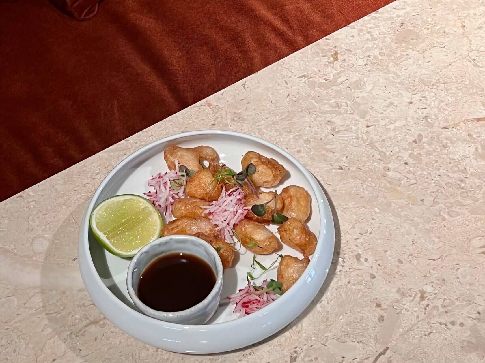 Попкорн из креветок (780₽) закрывает наше знакомство с разделом тёплых закусок. Хрустящие, лопающиеся и очень достойные малыши получились. Подаются в компании трёх мини-горок тёртого редиса — занятно.