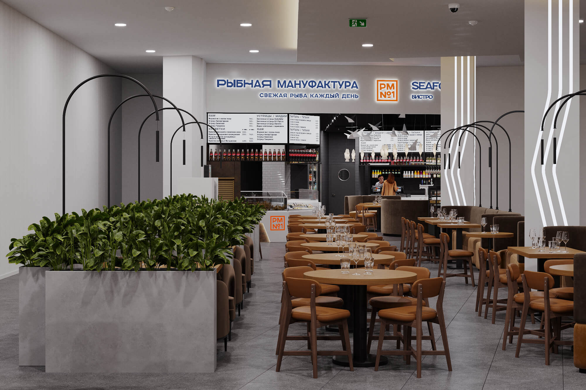Недавно в ТЦ Океания открылся шестой ресторан сети «Рыбная мануфактура». Для гостей выделили отдельную зону с комфортабельными диванами и стульями, установили большой бар, а все блюда повара готовят на открытой кухне.